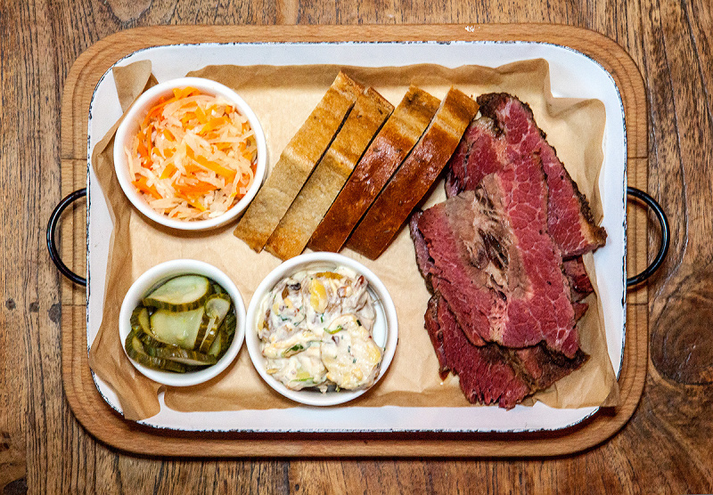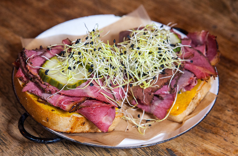 120g hovězího masa, kapary, lanýžový olej, marinované hořčičné semínko, okurky cornichons, libečkový olej, majonéza z přepuštěného másla, prach z uzeného oleje, opečený chléb na grilu, Burger Speciál