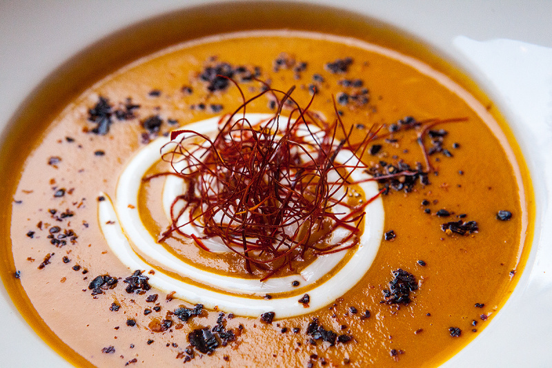 Sušené maliny, malinová omáčka, kumquat, pomerančová "hlína" z bílé čokolády, ganache z lesního ovoce Informace o obsažených alergenech poskytne obsluha na požádání.