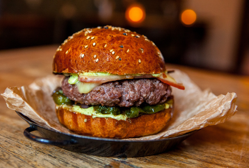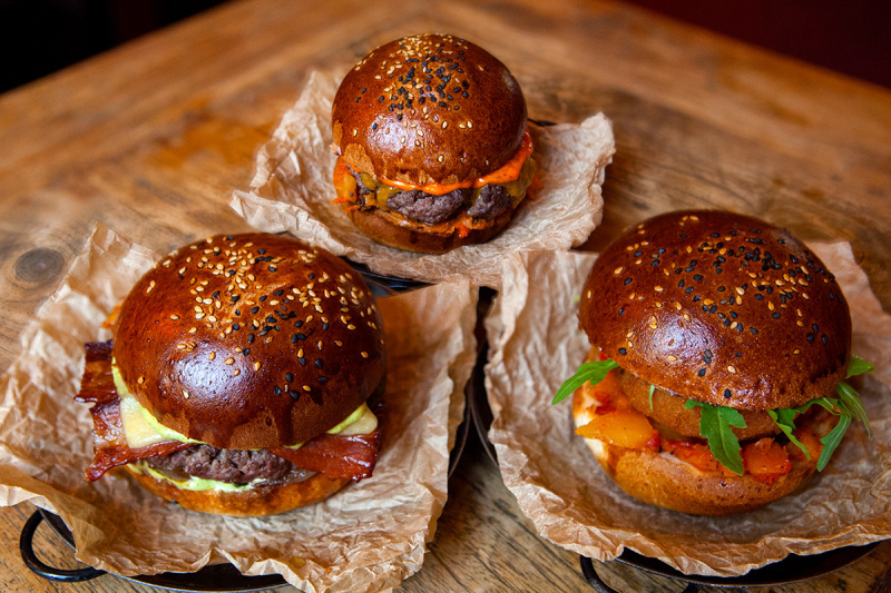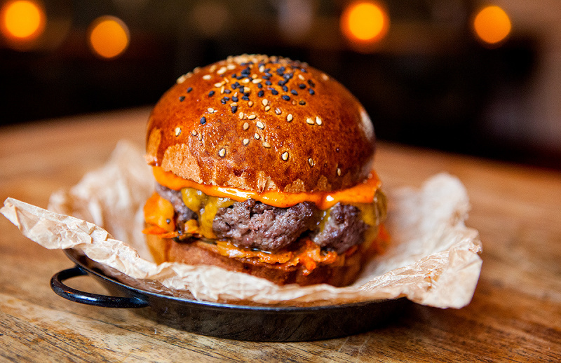 2×80 g hovězího masa, sýr cheddar, karamelizovaná cibule, majonéza z konfitovaného česneku a cibule, medová hořčice Tue